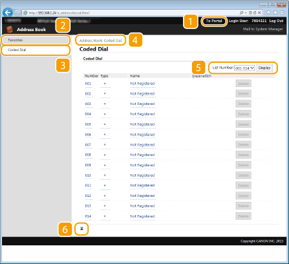 Prikaže registrirane kode za kodno izbiranje in vnose na seznamu Priljubljeno v imeniku. Imenik lahko registrirate ali uredite, če ste prijavljeni v načinu upravitelja sistema.