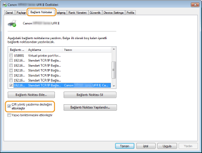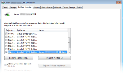 Eğer bir ağ bağlantısı kullanıyorsanız ve makinenin IP adresini değiştirdiysenizEğer seçilen bağlantı noktası için [Açıklama] öğesi [Canon MFNP Bağlantı Noktası] olarak seçilmiş ise ve makine ile bilgisayar aynı alt ağ üzerinde ise, bu durumda bağlantı korunur.Yeni bir bağlantı noktası eklemeniz gerekmez. Eğer [Standart TCP/IP Bağlantı Noktası] kullanıyorsanız, bu durumda yeni bir bağlantı noktası eklemeniz gerekir. Yazıcı Bağlantı Noktalarını Yapılandırma