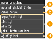 öğesine bastığınızda, yazdırılmakta, gönderilmekte veya alınmakta olan belgelerin ilerlemesinin yanı sıra, makinenin durumunu (toner kartuşunda kalan miktar vs.) ve makinenin IP adresi gibi ağ ayarlarını denetlemenize olanak sağlayan bir ekran görüntülenir.