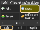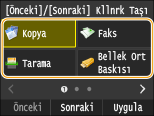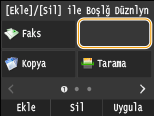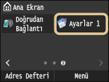 Ana Ekran Ekrana <Kopya>, <Faks> ve <Tarama> gibi sık kullanılan işlevler için kısayol düğmeleri ekleyebilirsiniz. Örneğin, bir ayar dizisini (ör. "Bir belgenin her iki tarafını tara, yüksek oranda sıkıştırılmış PDF dosyası olarak kaydet ve e-posta ile gönder") tek bir düğmeye atayarak görevleri daha hızlı ve verimli olarak yürütebilirsiniz.