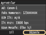 <Faks Ayarları> öğesinden <ECM İlt> veya <İlt Hızı> seçeneklerini de belirleyebilirsiniz. Ancak, <Adres Defteri> öğesinden yapılan ayarlar, Adres Defterinde kayıtlı hedeflerin ayrıntılı ayarları için etkinleştirilir. |