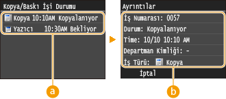 ![]() <Kopya/Baskı İşi Durumu>Kopyalanmakta olan, işlenmekte olan veya işlenmeyi bekleyen belgelerin bir listesini görüntüler.
