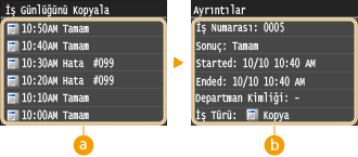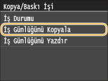 <İş Günlüğünü Görüntüle> öğesi, <Kapalı> olacak biçimde ayarlandığında, kopyalama işi günlüğünü denetleyemezsiniz. İş Günlüğünü Görüntüle