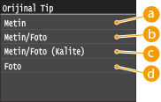 <Metin> ayarından başka bir ayar belirlenirse, <Arkaplan> öğesi otomatik olarak <Ayarla (Manüel)> şeklinde ayarlanır. Yoğunluk Ayarlama