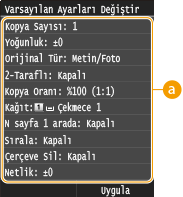 tuşuna bastığınızda görüntülenen ayarlardır. Bu varsayılan ayarları, sıkça gerçekleştirdiğiniz işlemlerle eşleşecek şekilde değiştirirseniz, kopya yaptığınız her seferde aynı ayarları yapılandırma gereksinimini ortadan kaldırabilirsiniz.