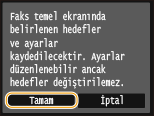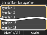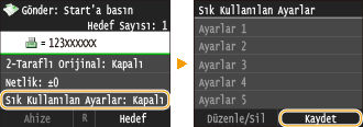 Kayıtlı ayarları düzenlemek ya da silmek için, <Faks>  <Sık Kullanılan Ayarlar>  <Düzenle/Sil>  <Düzenle> veya <Sil>öğesine gidin ve ardından aşağıdaki adımları izleyin.