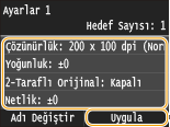 Bir ayarı düzenlemek için:Düzenlenecek ayarı seçin  Ayarı değiştirin ve  <Uygula>  <Evet> öğesine dokunun.