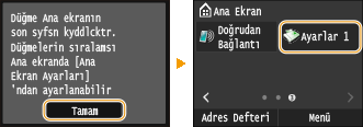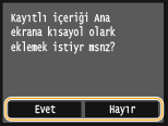 <Evet>seçeneğini belirlerseniz bir mesaj görünür. Mesajı kontrol edin ve <Tamam> öğesine dokunun. Kaydedilen ayar kombinasyonu Ana Ekran'a bir kısayol düğmesi olarak eklenir.