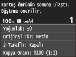 Makine faks alıyorsa veya otomatik rapor çıktısı ayarlandıysa, alınan fakslar ve raporlar makinede saklanır böylece yazdırılmalarının ardından soluk görünmezler. Kartuşta kalan toner miktarı azaldığı halde yazdırmaya devam etmek için <Kartuştaki Miktar Azken Yazdırmaya Devam Et> öğesini <Açık>olarak ayarlayın. Kartuştaki Miktar Azken Yazdırmaya Devam Et