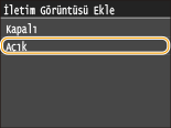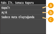<Açık> veya <Sadece Hata Oluştuğunda> seçeneğini belirlediğinizde faks belgesinin bir kısmı rapora eklenebilir. <İletim Görüntüsü Ekle> öğesini <Açık> olarak ayarlayın.