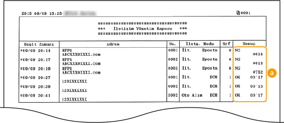 Hata Kodu Görüntülendiğinde). E-posta için, İletişim Yönetimi Raporları makine ile posta sunucusu arasındaki iletim sonucunu gösterir, makine ile hedef adres arasındaki sonucu göstermez.