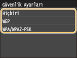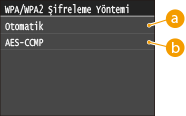 ![]() <Otomatik>Makineyi, kablosuz yönlendiricinin ayarıyla eşleşmesi için otomatik olarak AES-CCMP veya TKIP seçecek şekilde ayarlar.