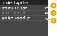 <Otomatik IP> öğesinin <Açık> olarak ayarlanıp ayarlanmadığını denetleyin.