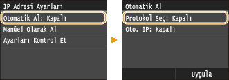 ![]() <Açık> öğesi görüntülenirse, <Otomatik Al> öğesine dokunun ve hem <Protokol Seç> hem de <Otomatik IP> öğesini <Kapalı> olarak ayarlayın.