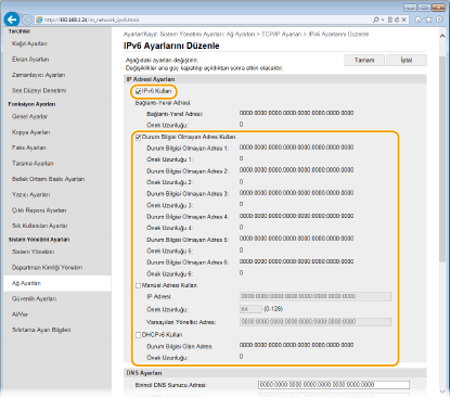 Makinenin IPv6 adresleri, Uzak Kullanıcı Arabirimi aracılığıyla yapılandırılabilir. IPv6 adreslerini ayarlamadan önce IPv4 adres ayarlarını denetleyin (IPv4 Ayarlarını Görüntüleme). IPv6 adreslerini kullanmak için doğru IPv4 ayarlarını ayarlamanız gerekir. Tarayıcı sürücüsünü veya MF Scan Utility'i kullanan tarama işlevinin bir IPv6 ortamında kullanılabilir olmadığını unutmayın. Makine, şu IPv6 adreslerinden en fazla dokuzunu kullanabilir: