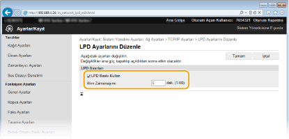 Veri alımı için yeniden başlatma bekleme süresi olarak 1 ile 60 (dakika) arasında bir değer ayarlayın. Ayarlanan süre içerisinde veri alımı sürdürülmezse yazdırma iptal edilir. |