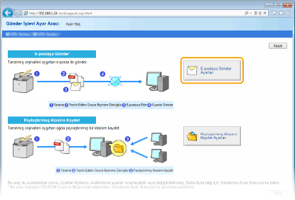 Gönder İşlevi Ayar Aracı e-posta göndermek için temel ayarları yapılandırmanıza yardımcı olur. Gönderme işlemi öncesi POP kimlik doğrulaması veya şifrelenmiş iletişim ayarları gibi daha detaylı ayarları yapılandırmak için Gönder İşlevi Ayar Aracı yerine Uzak Kullanıcı Arabirimini kullanabilirsiniz. E-Posta/I-Faks İletişim Ayarlarını Yapılandırma