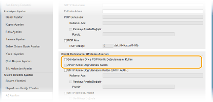 E-posta veya I-Faks göndermeden önce kimlik doğrulaması yapmak üzere POP3 sunucusunu kullanmak için onay kutusunu seçin.