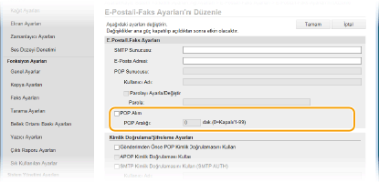 Bu seçenek ile, POP3 sunucusuna otomatik bağlanmak için kullanılan aralık (dakika olarak) ayarlanır Sunucuda herhangi bir I-Faks belgesi varsa bunlar otomatik olarak alınır ve yazdırılır.