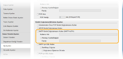 SMTP kimlik doğrulamasını (SMTP AUTH) yapılandırırsanız, e-posta veya I-Faks gönderimi esnasında kullanıcı adı ve parola ile kullanıcı kimliği belirlemesi yapılır.