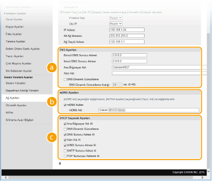 Bonjour tarafından kabul edilen mDNS (çok noktaya yayın DNS), DNS kullanmadan ana bilgisayar adını bir IP adresi ile ilişkilendirme protokolüdür. mDNS'yi etkinleştirmek için onay kutusunu seçin ve [mDNS Adı] metin kutusuna mDNS adını girin. [DHCP Seçenek Ayarları][Ana Bilgisayar Adı Al]
