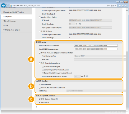 IPv4'tekiyle aynı mDNS adını kullanmak için onay kutusunu seçin. Farklı bir ad ayarlamak için onay kutusunu temizleyin ve [mDNS Adı] metin kutusuna mDNS adını girin. [DHCP Seçenek Ayarları][DNS Sunucu Adresi Al]