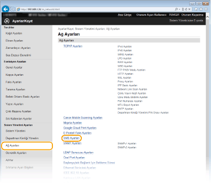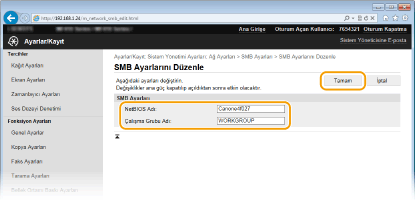 Sunucu İleti Bloğu (SMB), bir ağ üzerinde dosya ve yazıcı gibi kaynakları birden çok aygıt ile paylaşma protokolüdür. Makine, taranan belgeleri paylaşılan klasörde saklamak için SMB'yi kullanır. Ağınıza bağlı olarak, NetBIOS adını ve çalışma grubu adını ayarlamanız gerekebilir.
