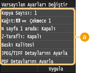<Menü>  <Bellek Ortamı Baskı Ayarları> <Varsayılan Ayarları Değiştir> Ayarı seçin Seçilen öğenin varsayılan değerini değiştirin <Uygula>