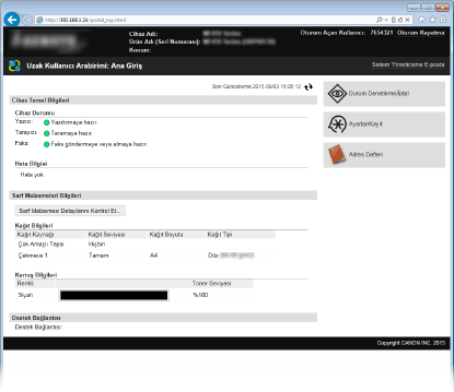 Tüm Uzak Kullanıcı Arabirimi işlemlerini ve ayarlarını gerçekleştirebilirsiniz. Bir Sistem Yöneticisi Kimliği belirlendiyse, Oturum Açma Adını [Sistem Yöneticisi Kimliği] kısmına ve PIN'i [Sistem Yöneticisi PIN'i] kısmına girin.