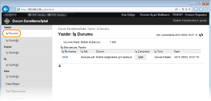 Ayrıntılı bilgileri görüntülemek için duraklatılan belgelerde ve güvenli belgelerde [İş Numarası] öğesini tıklatın. Yazdırılan belgenin kullanıcı adını ve sayfa sayısını denetleyebilirsiniz.