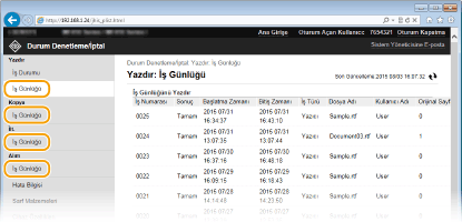 Yazdırma, kopyalama, faks/e-posta gönderme (TX) veya faks alma (RX) geçmişi görüntülenir.