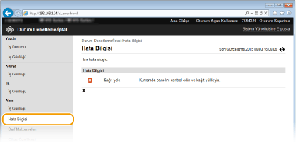 Bir hata oluştuğunda, Portal Sayfası (ana sayfa)[Hata Bilgisi]altında görüntülenen mesaj tıklatılarak bu sayfa görüntülenir.
