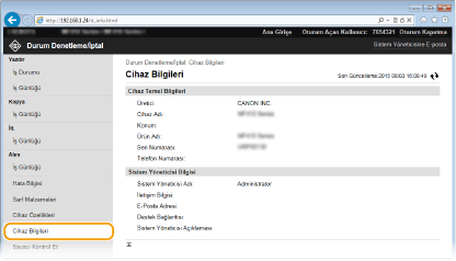 Makine ve sistem yöneticisiyle ilgili bilgiler görüntülenir. Bu bilgiler, [Ayarlar/Kayıt] sayfasındaki [Sistem Yönetimi] içinde ayarlanır. Sistem Yönetimi Ayarları