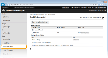 Kağıt kaynağı için kağıt boyutu ve türü, toner kartuşu modeli numarası vs. görüntülenir. Bu sayfayı görüntülemek için Portal Sayfası (ana sayfa)[Sarf Malzemesi Detaylarını Kontrol Et]öğesini de tıklatabilirsiniz.