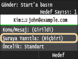 Yanıt adresi varsayılan olarak ayarlanmaz. Makinenin yanıt adresinden farklı bir yanıt adresi görüntülemek isterseniz Adres Defterinde kayıtlı adreslerden birini belirtin. Adres Defterinde kayıtlı hedef yoksa bkz. Adres Defterine Kaydetme.