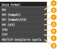 Belgelerin taranacağı dosya biçimini PDF/JPEG/TIFF seçeneklerinden seçebilirsiniz. PDF için, küçültülmüş dosya boyutuna sahip, yüksek oranda sıkıştırılmış bir PDF dosyasını veya metin aramaya izin veren, OCR (Optik Karakter Tanıma) tarafından hazırlanmış PDF dosyasını seçebilirsiniz.