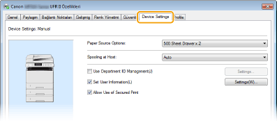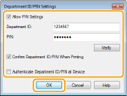 Bir bilgisayardan yazdırma veya fakslama işlemi yaptığınız her seferde [Confirm Department ID/PIN] (Departman Kimliğini/PIN Onayla) açılır ekranını görüntülemek için onay kutusunu işaretleyin. [Authenticate Department ID/PIN at Device] (Aygıtta Departman Kimliği/PIN Doğrula)