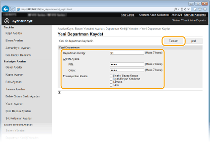 PIN ayarını etkinleştirmek için onay kutusunu seçin. [Department ID] (Departman Kimliği)