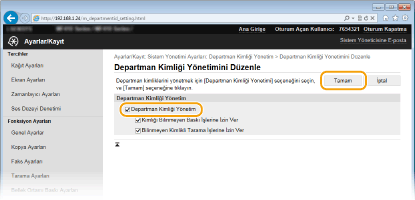 [User Management] (Kullanıcı Yönetimi) altındaki [Department ID Management] (Departman Kimliği Yönetimi) onay kutusunu işaretleyin. |
