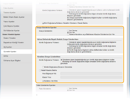 Paylaşılan klasörlere ve FTP sunucularına kaydetmeyi engeller. Tarama işlevindeki <Dosya> artık kullanılamaz.