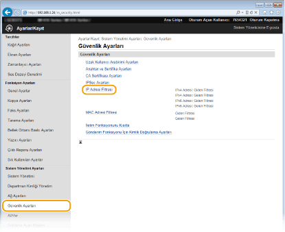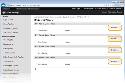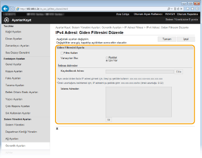 IP adresleri yanlış girildiyse Uzak Kullanıcı Arabirimi'nden makineye erişemeyebilirsiniz ve bu durumda <IPv4 Adres Filtresi> veya <IPv6 Adres Filtresi> öğesini <Kapalı> durumuna getirmeniz gerekir.