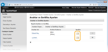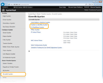 [Anahtar ve Sertifika Ayarları] veya [CA Sertifikası Ayarları] öğesini tıklatın.