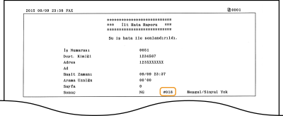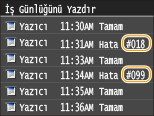 Yazdırmanın başarısız olması veya faks ya da taranmış bir belgenin gönderilememesi veya alınamaması gibi bir hata meydana geldiğinde ilgili hata kodu bir raporda veya <İş Günlüğü> ekranında üç basamaklı sayı şeklinde görüntülenir. Her hata kodu için nedenleri ve çözümleri öğrenmek için aşağıdakileri denetleyin. Rapordaki bilgiler ve hata raporunu yazdırma bilgileri için bkz.