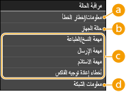 ، تظهر شاشة تمكنك من تفقد حالة المستندات الجاري طباعتها أو إرسالها او استلامها، بالإضافة إلى حالة الجهاز (كمية الحبر المتبقية في الخرطوشة، إلخ) وإعدادات الشبكة مثل عنوان IP الخاص بالجهاز.