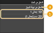 )، يتم عرض الشاشة <التحقق من العداد>. من هذه الشاشة، يمكنك مشاهدة قيم عدادات المطبوعات وكذلك الرقم التسلسلي للجهاز وتكوين الجهاز.