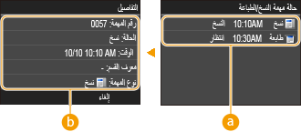 ![]() <حالة مهمة النسخ/الطباعة>يعرض قائمة بالمستندات التي يتم نسخها حاليًا أو التي تتم معالجتها حاليًا أو التي تنتظر المعالجة.