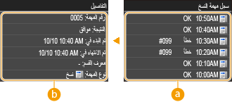 ![]() <سجل مهمة النسخ>يعرض قائمة بالمستندات التي تم نسخها. يتم عرض <OK> عندما يتم نسخ المستند بنجاح، ويتم عرض <خطأ> عندما تفشل عملية نسخ المستند نتيجة لإلغائها أو لوجود خطأ ما.