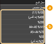 يمكنك تكبير النسخ أوتصغيرها باستخدام معدل نسخ محدد مسبقًا مثل <A5->A4>، أو عن طريق إعداد معدل نسخ مخصصة قدرها ١٪.