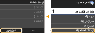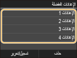 إذا أردت حذف إعداد مسجل، انقر على <نسخ>  <الإعدادات المفضلة>  <حذف>  قم باختيار الإعدادات  <نعم>  <نعم>.