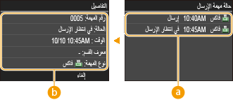 ![]() <حالة مهمة الإرسال>/<حالة مهمة الاستلام>تعرض قائمة المستندات التي يتم إرسالها واستلامها أو قيد المعالجة.